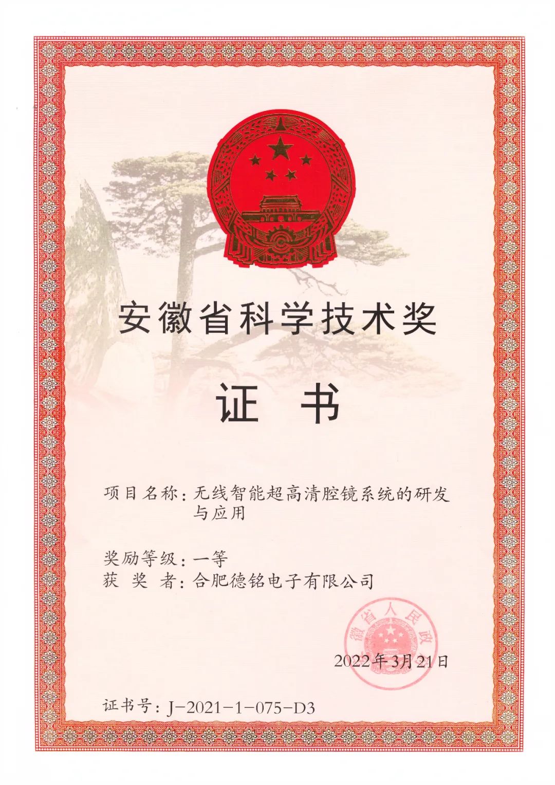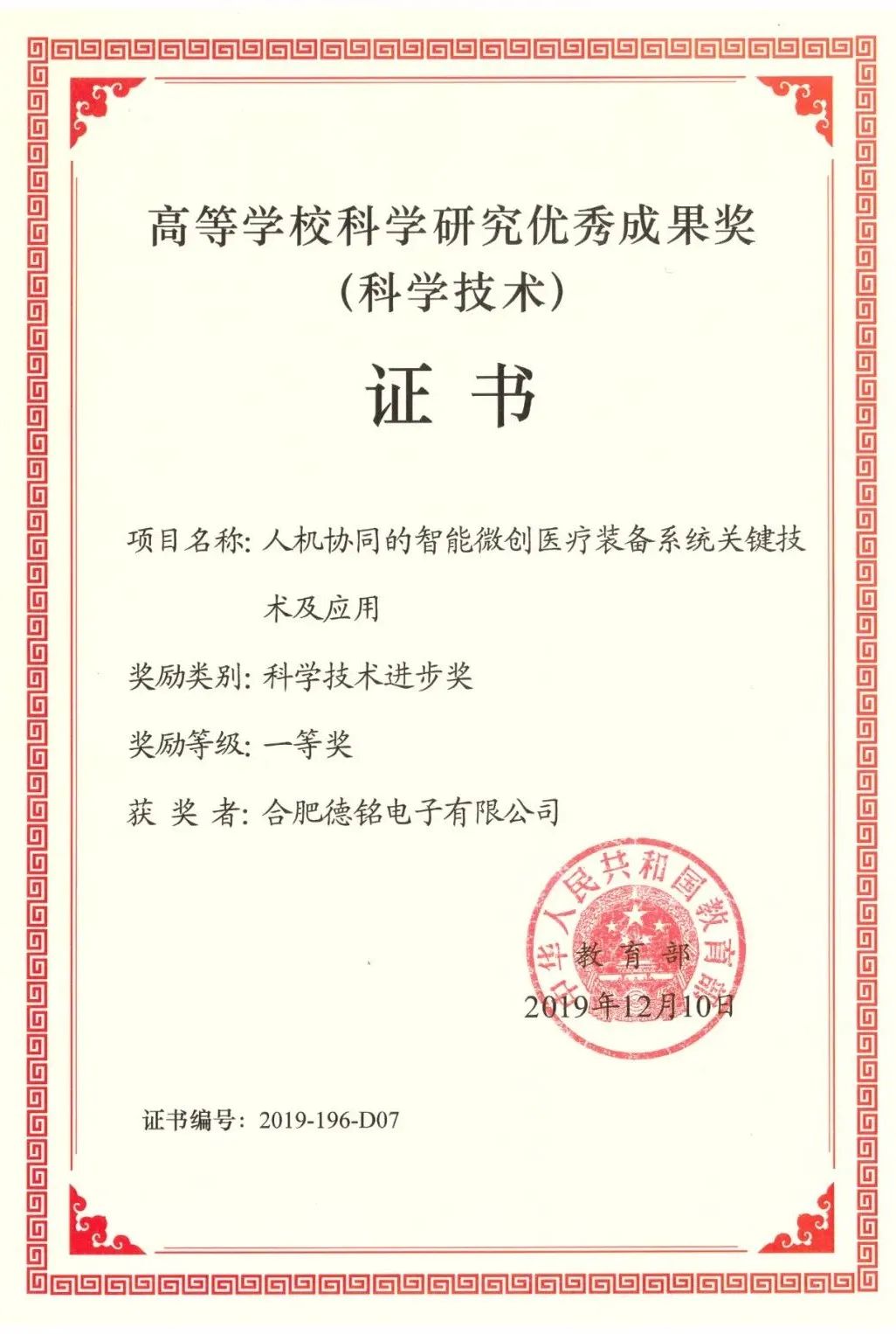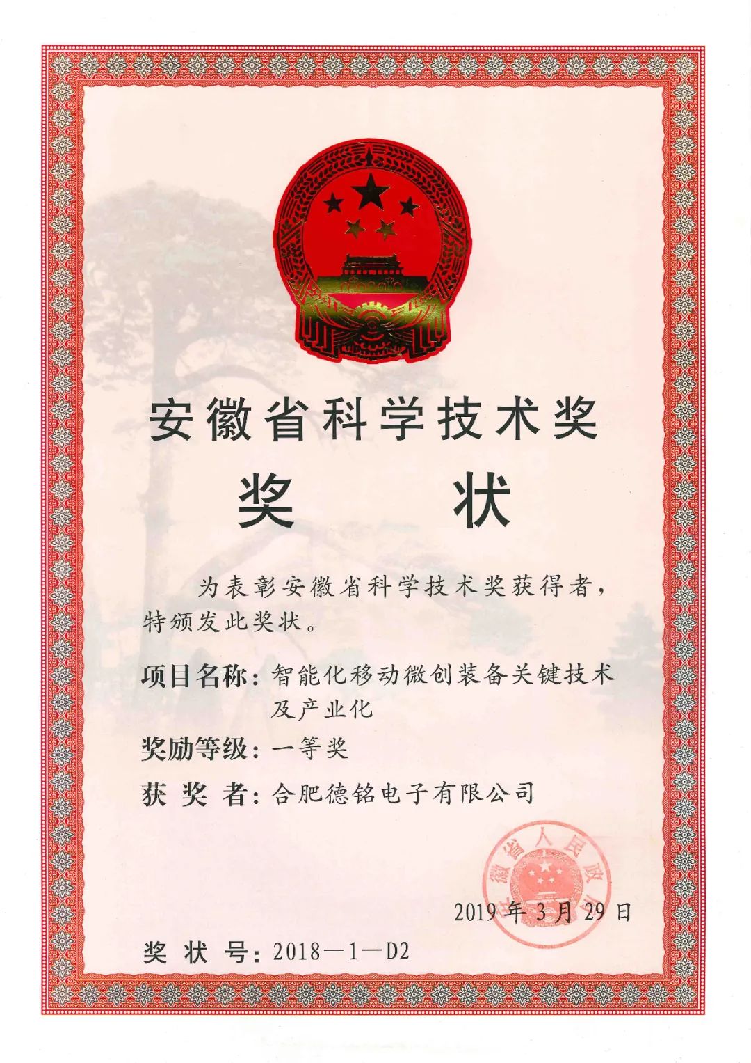 近日,由安徽省科学技术协会推荐,德铭电子研发的《智能化移动微创装备关键技术及产业化》项目,经中国民营科技促进会预审、最终评审、公示后(因疫情原因延期评审),荣获“2019年度民营科技发展优秀贡献奖”。